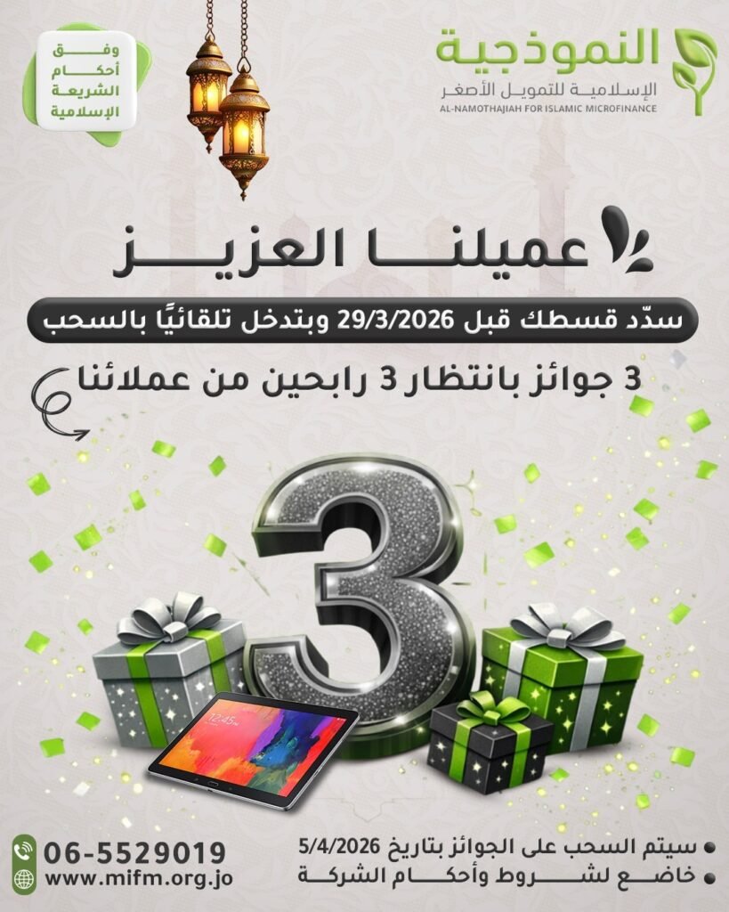 سدد قسط شهر 3 قبل 29/3/2026 وبتدخل تلقائياً بالسحب على جوائزنا ” اجهزة تابلت “